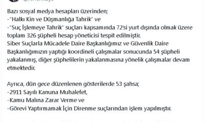 Bakan Yerlikayanın sosyal medya hesabından yaptığı açıklamaya göre; bazı sosyal medya hesapları üzerinden Halkı kin ve düşmanlığa tahrik ve Suç işlemeye tahrik suçları kapsamında 72si yurt...