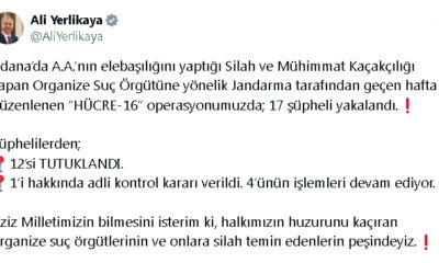 Bakan Ali Yerlikayanın sosyal medya hesabından yaptığı açıklamaya göre; Adana ve Karataş Cumhuriyet başsavcılıkları ile Jandarma Genel Komutanlığı Kaçakçılık ve Organize Suçlarla Mücadele Daire Başkanlığı koordinesinde...
