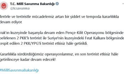 Bakanlığın sosyal medya hesabından yapılan açıklamada, “Terörle ve teröristle mücadelemiz artan bir şiddet ve tempoda kararlılıkla devam ediyor. Irakın kuzeyinde başarıyla devam eden Pençe-Kilit Operasyonu bölgesinde...