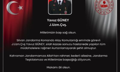 Bakan Yerlikaya, sosyal medya üzerinden yaptığı açıklamada, “Silvan Komando Alay Komutanlığı emrinde görevli Jandarma Uzaman Çavuş Yavuz Güney, silah kazası sonucu hastanede yapılan tüm müdahalelere rağmen kurtarılamayarak...