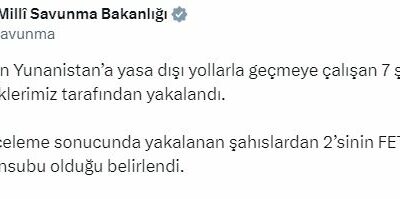 Bakanlığın sosyal medya hesabından yapılan açıklamada, “Ülkemizden Yunanistana yasa dışı yollarla geçmeye çalışan 7 şahıs, hudut birliklerimiz tarafından yakalandı. Yapılan inceleme sonucunda yakalanan şahıslardan 2sinin FETÖ...
