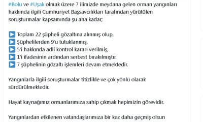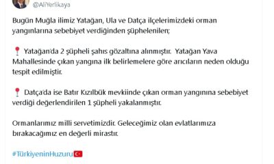İçişleri Bakanı Ali Yerlikaya, sosyal medya hesabından yaptığı paylaşımda, Bugün Muğlaya bağlı Yatağan, Ula ve Datça ilçelerindeki orman yangınlarına sebebiyet verdiğinden şüphelenilen toplamda 3 kişinin yakalandığını...