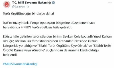 Bakanlığın sosyal medya hesabından yapılan açıklamada, “Terör örgütüne ağır bir darbe daha. Irakın kuzeyindeki Pençe operasyon bölgesine düzenlenen hava harekatında 4 PKKlı terörist etkisiz hale getirildi....