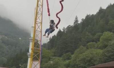 Çaykara ilçesindeki turizm merkezi Uzungöl’ü ziyaret eden Semanur Şahin, arkadaşlarıyla adrenalin yaşamak için ‘insan sapanı’ diye adlandırılan ‘bungy catapult’u deneyimlemek istedi. Esneyebilen halatlı mekanizmaya bağlanan Şahin,...