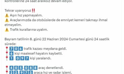Bakan Yerlikaya, sosyal medya hesabından yaptığı açıklamada, “Bugün Kurban Bayramı tatilinin son günü. Karayollarımızda trafik yoğunluğu var. Trafik polislerimiz ve jandarma trafiğimiz denetimlerine ve radarla hız...