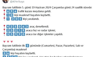 Bakan Ali Yerlikaya, sosyal medya hesabından yaptığı açıklamada, “Bayram tatilinin 5inci günü, 19 Haziran 2024 Çarşamba günü 24 saatlik sürede; 696 trafik kazası meydana geldi. 10...