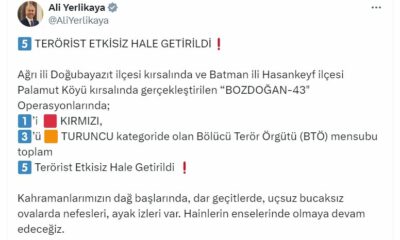 İçişleri Bakanı Yerlikaya: Ağrı ili Doğubayazıt ilçesi kırsalında ve Batman ili Hasankeyf ilçesi Palamut Köyü kırsalında gerçekleştirilen “BOZDOĞAN-43″ Operasyonlarında; 1i kırmızı, 3ü turuncu kategoride olan Bölücü...