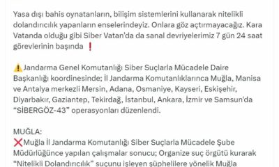Bakan Ali Yerlikaya, sosyal medya hesabından yaptığı açıklamada, Jandarma Genel Komutanlığı Siber Suçlarla Mücadele Daire Başkanlığı koordinesinde; il jandarma komutanlıkları tarafından Muğla, Manisa ve Antalya merkezli...