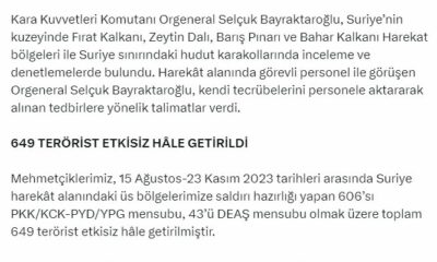 MİLLİ Savunma Bakanlığı, 15 Ağustos-23 Kasım tarihleri arasında Suriye harekat alanındaki üs bölgelere saldırı hazırlığı yapan 606’sı PKK/KCK-PYD/YPG, 43’ü DEAŞ mensubu olmak üzere toplam 649 teröristin...