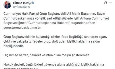 Adalet Bakanı Yılmaz Tunç, sosyal medya hesabından yaptığı açıklamada, “Cumhuriyet Halk Partisi Grup Başkanvekili Ali Mahir Başarırın, Sayın Cumhurbaşkanımıza yönelik sarf ettiği sözlerle ilgili Ankara Cumhuriyet...