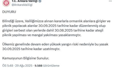 Valiliğin sosyal medya hesabından yapılan açıklamada, “Bilindiği üzere, Valiliğimizce alınan kararlarla ormanlık alanlara girişler ve piknik yapılacak alanlar 30 Eylül 2025 tarihine kadar düzenlenmiş olup girişleri...