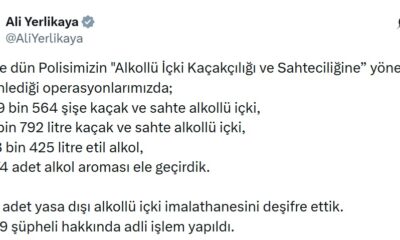 İçişleri Bakanı Ali Yerlikaya, 81 ilde polis tarafından düzenlenen operasyonları sosyal medya hesabından paylaştı. Buna göre; Alkollü içki kaçakçılığı ve sahteciliğine yönelik düzenlediği operasyonlarda 119 bin...