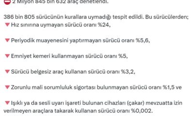 Bakan Yerlikaya, sosyal medya hesabından yaptığı açıklamada, “25-31 Temmuz 2025 tarihleri arasında, emniyet ve jandarma trafik ekiplerimizce; 2 milyon 845 bin 632 araç denetlendi. 386 bin...
