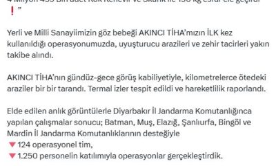 İçişleri Bakanı Ali Yerlikaya, Diyarbakır’da jandarma tarafından düzenlenen narkotik operasyonunu sosyal medya hesabından paylaştı. Buna göre; yerli taarruzi insansız hava aracı AKINCInın ilk kez kullanıldığı operasyonda,...