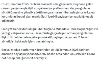 Bakan Yerlikaya, sosyal medya hesabından yaptığı açıklamada, “01-28 Temmuz 2025 tarihleri arasında ülke genelinde meydana gelen orman yangınlarıyla ilgili sosyal medya platformlarında, yangınların söndürülmesine yönelik yürütülen...