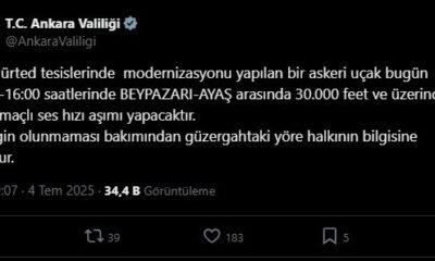 Valiliğin sosyal medya hesabından yapılan açıklamada, “TAI Mürted tesislerinde modernizasyonu yapılan bir askeri uçak bugün 15.00-16.00 saatlerinde Beypazarı-Ayaş arasında 30 bin feet ve üzerinde test amaçlı...