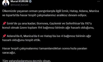 Çevre, Şehircilik ve İklim Değişikliği Bakanı Murat Kurum, sosyal medya hesabından yaptığı açıklamada, “Ülkemizde yaşanan orman yangınlarıyla ilgili İzmir, Hatay, Adana, Manisa ve Ispartada hasar tespit...