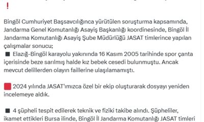Bakan Yerlikaya, sosyal medya hesabından yaptığı açıklamada, “Bingöl Cumhuriyet Başsavcılığınca yürütülen soruşturma kapsamında, Jandarma Genel Komutanlığı Asayiş Başkanlığı koordinesinde, Bingöl İl Jandarma Komutanlığı Asayiş Şube Müdürlüğü...