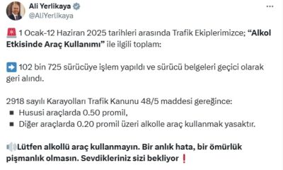Bakan Yerlikaya, sosyal medya hesabından yaptığı açıklamada, “1 Ocak-12 Haziran 2025 tarihleri arasında trafik ekiplerimizce; alkol etkisinde araç kullanımı ile ilgili toplam 102 bin 725 sürücüye...
