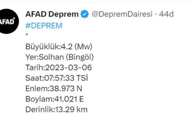 BİNGÖL’ün Solhan ilçesinde 4.2 büyüklüğünde deprem meydana geldi. Afet ve Acil Durum Yönetimi Başkanlığı (AFAD) verilerine göre; saat 07.57’de merkez üssü Bingöl’ün Solhan ilçesi olan 4.2...