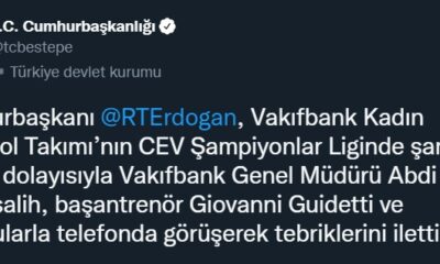 CUMHURBAŞKANI Recep Tayyip Erdoğan, kadınlar şampiyonlar ligindeki başarıları nedeniyle Vakıfbank Genel Müdürü Abdi Serdar Üstünsalih, başantrenör Giovanni Guidetti ve oyuncuları tebrik etti. Cumhurbaşkanlığından yapılan açıklamaya göre; Cumhurbaşkanı...