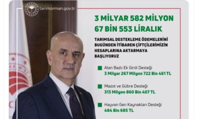 TARIM ve Orman Bakanı Vahit Kirişci, “3 milyar 582 milyon 67 bin 553 liralık tarımsal destekleme ödemelerini bugünden itibaren çiftçilerimizin hesaplarına aktarmaya başlıyoruz” dedi. Bakan Kirişci,...