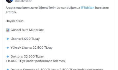 Bakan Mehmet Fatih Kacır, sanal medya hesabından yaptığı açıklamada, “Araştırmacılarımıza ve öğrencilerimize sunduğumuz TÜBİTAK burslarını artırdık. Hayırlı olsun. Güncel burs miktarları: Lisans öğrencileri için aylık 6...