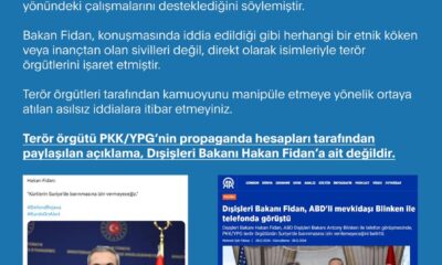 DMMnin sosyal medya hesabı üzerinden yapılan açıklamada, “Terör örgütü PKK/YPG’nin propaganda hesapları tarafından paylaşılan açıklama, Dışişleri Bakanı Hakan Fidan’a ait değildir. Dışişleri Bakanı Hakan Fidan, ABD...