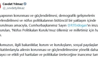 Cumhurbaşkanı Yardımcısı Cevdet Yılmaz, sosyal medya hesabından yaptığı açıklamada, Resmi Gazetede yayımlanan Aile ve Sosyal Hizmetler Bakanlığı bünyesinde Nüfus Politikaları Kurulu kurulmasına ilişkin Cumhurbaşkanlığı kararnamesini değerlendirdi....