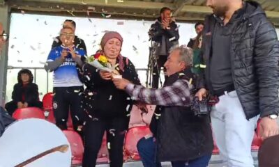 ADANAnın Saimbeyli ilçesinde pazarcı Adnan Kılıç (55), tribünde maç izlediği 34 yıllık eşi Canan Kılıça (51) davullu zurnalı sürpriz yıl dönümü kutlaması yaptı. Diz çöküp eşine...