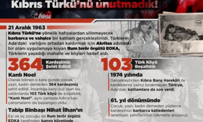 Bakanlığın sosyal medya hesabından yapılan açıklamada, “Kanlı Noel olarak bilinen vahşice olaylarda çocuk, yaşlı, kadın demeden Kıbrıs Türkünü barbarca katleden Rum teröristleri lanetliyor, şehitlerimizi rahmetle anıyoruz”...