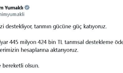 Bakan Yumaklı sosyal medya hesabından yaptığı açıklamada, “Üreticimizi destekliyor, tarımın gücüne güç katıyoruz. Toplam 1 milyar 445 milyon 424 bin TL tarımsal destekleme ödemesini bugün çiftçilerimizin...