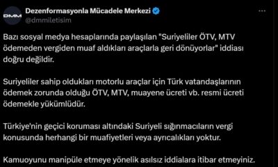 DMMnin sosyal medya hesabından yapılan açıklamada, “Bazı sosyal medya hesaplarında paylaşılan Suriyeliler ÖTV, MTV ödemeden vergiden muaf aldıkları araçlarla geri dönüyorlar iddiası doğru değildir. Suriyeliler sahip...