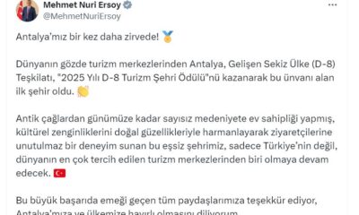 Bakan Ersoy, sosyal medya hesabından yaptığı açıklamada, Antalyanın bir kez daha zirvede olduğunu belirterek, “Dünyanın gözde turizm merkezlerinden Antalya, Gelişen Sekiz Ülke (D-8) Teşkilatı, 2025 Yılı...