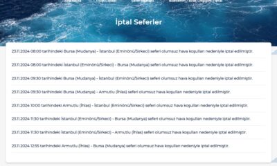 BUDOdan yapılan duyuruda, 08.00 ile 12.55 saatleri arasında yapılması planlanan Bursa (Mudanya) – İstanbul (Eminönü/Sirkeci), İstanbul (Eminönü/Sirkeci) – Bursa (Mudanya), Bursa (Mudanya) – İstanbul (Eminönü/Sirkeci), Bursa...