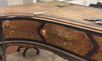 Atölyede restorasyonu tamamlanmak üzere olan eserlerden biri olan Sultan II. Abdülhamid tuğralı taht, üzeri sedef ve fildişi süslemelerle bezeli, taç ve ayak kısmı sedefle geometrik bölümlere...