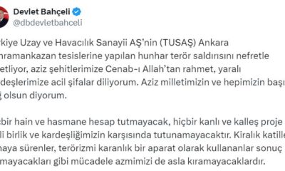 Bahçeli, sosyal medya hesabından yaptığı açıklamada, “TUSAŞın Ankara Kahramankazan tesislerine yapılan hunhar terör saldırısını nefretle lanetliyor, aziz şehitlerimize Cenab-ı Allah’tan rahmet, yaralı kardeşlerimize acil şifalar diliyorum....