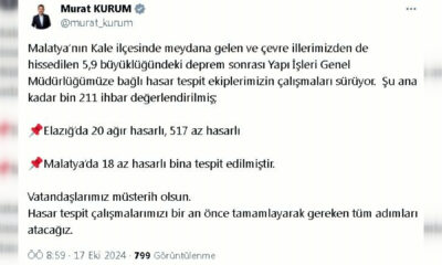 Bakan Kurum, sosyal medya hesabından yaptığı açıklamada, “Malatyanın Kale ilçesinde meydana gelen ve çevre illerimizden de hissedilen 5.9 büyüklüğündeki deprem sonrası Yapı İşleri Genel Müdürlüğümüze bağlı...