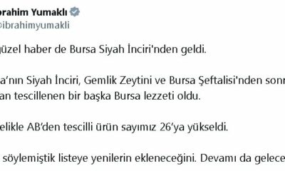 Tarım ve Orman Bakanı İbrahim Yumaklı, sosyal medya hesabından yaptığı açıklamada, “Bir güzel haber de Bursa siyah incirinden geldi. Bursanın siyah inciri, Gemlik zeytini ve Bursa...