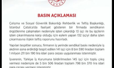 Bakanlıktan yapılan yazılı açıklamada, İstanbul Çatalcada faaliyet gösteren bir firmada sendikanın örgütlenme çalışmaları nedeniyle 13 kişinin işten çıkarıldığını ve ardından bu işçilerin işten çıkarılmasına karşı eylem...