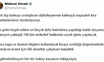 Bakan Şimşek, sosyal medya hesabından yaptığı açıklamada, “Kayıt dışı kalmayı zorlaştıran dijitalleşmenin katkısıyla kapsamlı kira denetimlerimizi sürdürüyoruz. Kira geliri tespit edilen ve birçok defa hatırlatma yapıldığı...