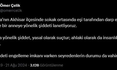 AK Parti Sözcüsü Ömer Çelik, sosyal medya hesabından yaptığı paylaşımda, “Manisa’nın Akhisar ilçesinde sokak ortasında eşi tarafından darp edilen hamile bir anneye yönelik şiddeti lanetliyoruz. Kadına...