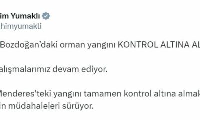 Bakan Yumaklı, sosyal medya hesabından yaptığı açıklamada, “Aydın Bozdoğandaki orman yangını kontrol altına alındı. Soğutma çalışmalarımız devam ediyor. İzmir Menderesteki yangını tamamen kontrol altına almak için...