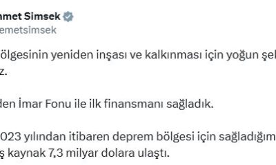 Hazine ve Maliye Bakanı Mehmet Şimşek, sosyal medya hesabından yaptığı açıklamada, “Deprem bölgesinin yeniden inşası ve kalkınması için yoğun şekilde çalışıyoruz. Afet Yeniden İmar Fonu ile...