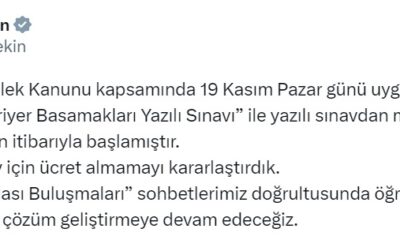 MİLLİ Eğitim Bakanı Yusuf Tekin, Öğretmenlik Kariyer Basamakları Yazılı Sınavına girecek öğretmenlerden ücret alınmayacağını açıkladı. Bakan Tekin, sosyal medya hesabından yaptığı açıklamada, “Öğretmenlik Meslek Kanunu kapsamında...