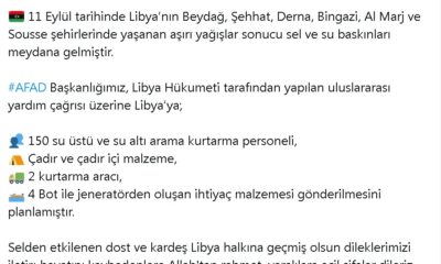 AFET ve Acil Durum Yönetimi Başkanlığı (AFAD), yaşanan sel felaketi nedeniyle Libya’ya yardım gönderecek. 11 Eylül’de Libya’nın Beydağ, Şehhat, Derna, Bingazi, Al Marj ve Sousse şehirlerinde yaşanan...