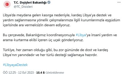 DIŞİŞLERİ Bakanlığı, Libya’da meydana gelen kasırga nedeniyle oluşan sel felaketine destek ve yardım sağlanması çalışmaları kapsamında, insani yardım ve arama-kurtarma ekibi içeren 3 uçak gönderileceğini açıkladı....