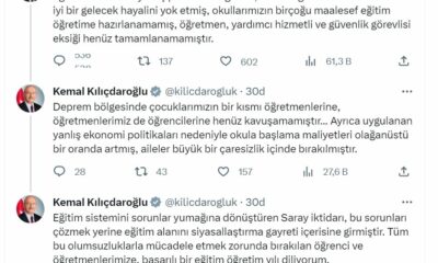 CHP Genel Başkanı Kemal Kılıçdaroğlu, “Okullarımızın birçoğu maalesef eğitim öğretime hazırlanamamış, öğretmen, yardımcı hizmetli ve güvenlik görevlisi eksiği henüz tamamlanamamıştır” dedi. Kılıçdaroğlu, sosyal medya hesabından yaptığı...
