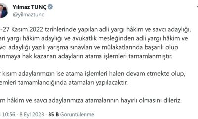 ADALET Bakanı Yılmaz Tunç, “26-27 Kasım 2022 tarihlerinde yapılan adli yargı hakim ve savcı adaylığı, idari yargı hakim adaylığı ve avukatlık mesleğinden adli yargı hakim ve...
