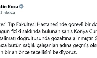 SAĞLIK Bakanı Fahrettin Koca, Konya Selçuk Üniversitesi Tıp Fakültesi Hastanesi’nde görevli bir doktora saldırıda bulunan şüphelinin gözaltına alındığını duyurdu. Bakan Koca, Twitter üzerinden yaptığı açıklamada, “Selçuk...